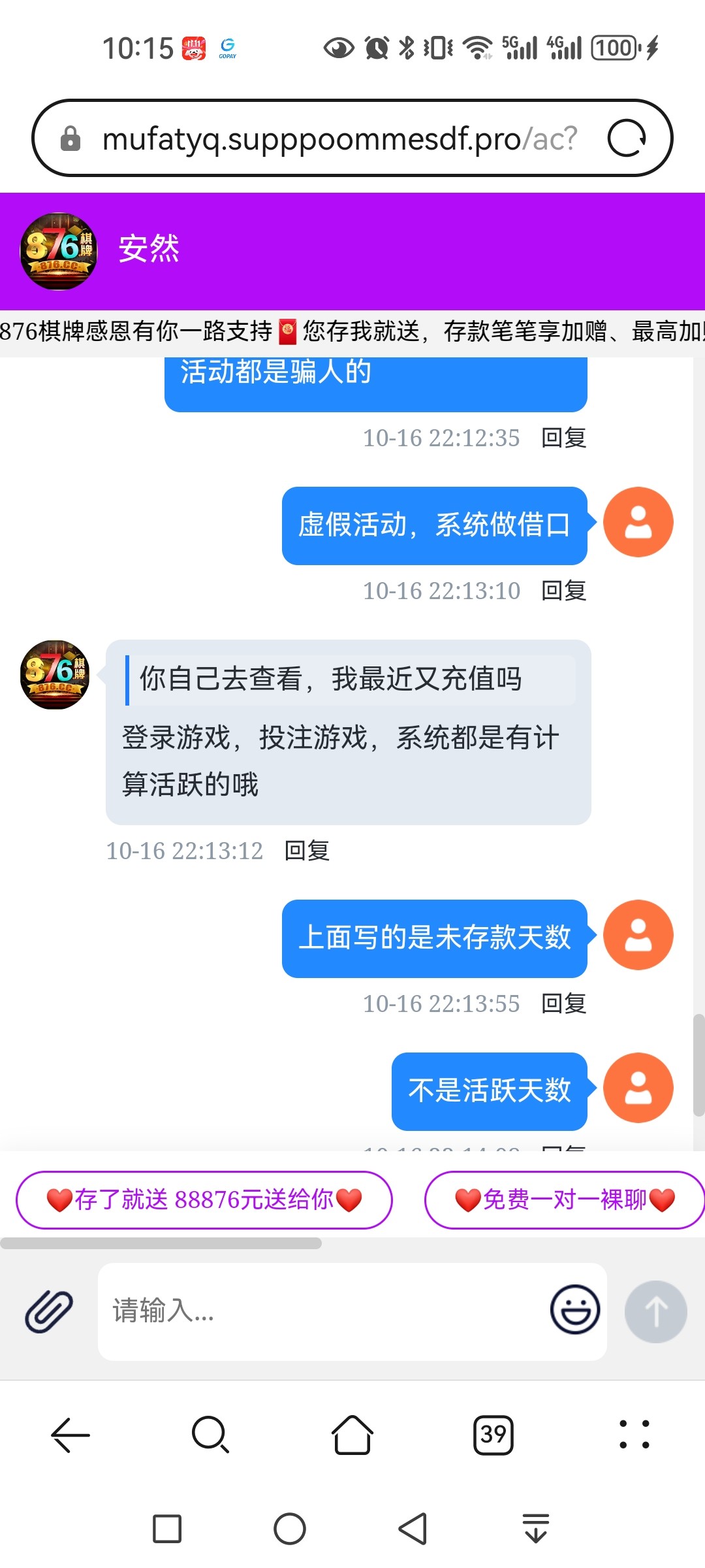 给我来电顺送彩金,送了8元过了一会又说他们没有邀请我,立马又扣了,还有里面的那个回归活动也是骗人的,我最起码也有半年玩了,当我充值后找客服送彩金,却送了15天未充值的18彩金,我去找客服,她说系统送的,按照系统为准,既然不按活动规则开派送,就是骗人